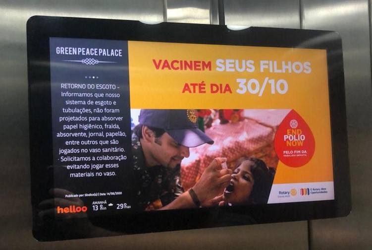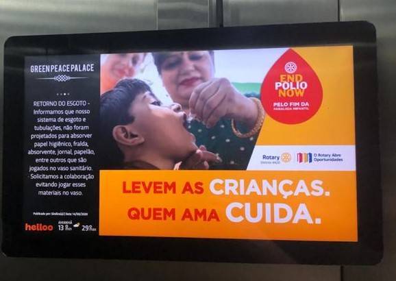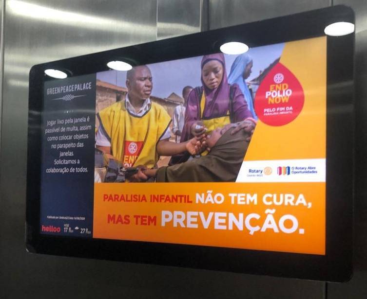 Por intermédio do Presidente Motivador do RC Monte Serrat, Lupércio Simão Conde Jr., parceria do grupo Helloo (mídias digitais em elevadores) e apoio do Distrito 4420, a Campanha End Polio Now, foi veiculada em 45 cidades do país, em mais de 1000 endereços.