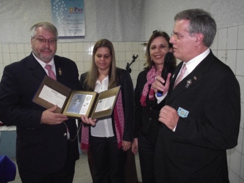 O governador retribuiu a homenagem, com a peça artesanalmente confeccionada pela artista plástica Rosa Maria da Paz que é sócia do clube e governadora assistente da área. A imagem da jovem Sadako Sasaki, vítima do ataque a bomba em Hiroshima, retrata o grito e a oração pela Paz na terra.