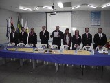 Na foto, registro da Visita Oficial do governador Marcos Luiz Zanardo e sua esposa Maria Laiz, ladeados pelo casal presidente Celso e Glaudiceia, a posse dos novos companheiros e a mesa de reunião composta para a festiva.