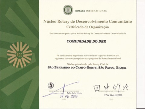 O Rotary Club de São Bernardo Norte recebeu o diploma oficial em reconhecimento ao seu empenho na formação do NRDC da Comunidade do DER, que conta com 18 líderes e todo apoio dos rotarianos nesta importante inciativa na Cidade de São Bernardo do Campo-SP.