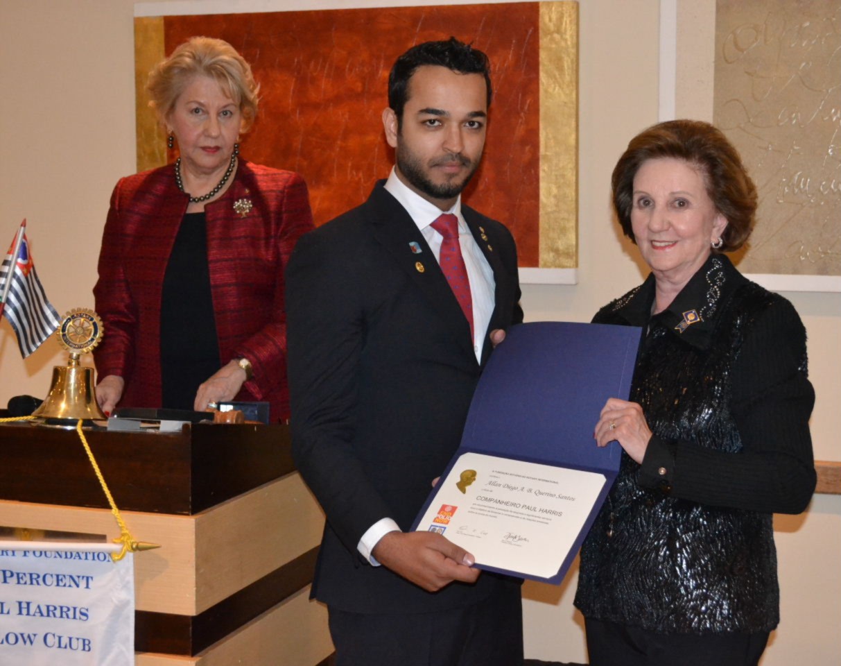 O Presidente Allan Bravos também recebeu das mãos da companheira Martha Abdala o título Paul Harris Society, por suas importantes contribuições junto às ações do clube. Ele aproveitou a ocasião para agradecer a presença de todos e todo apoio recebido dos companheiros, de sua namorada Jéssica, mas principalmente, o carinho da mãe e toda formação que ela lhe proporcionou, possibilitando a ele, muitas realizações.