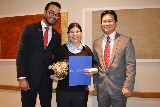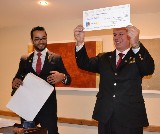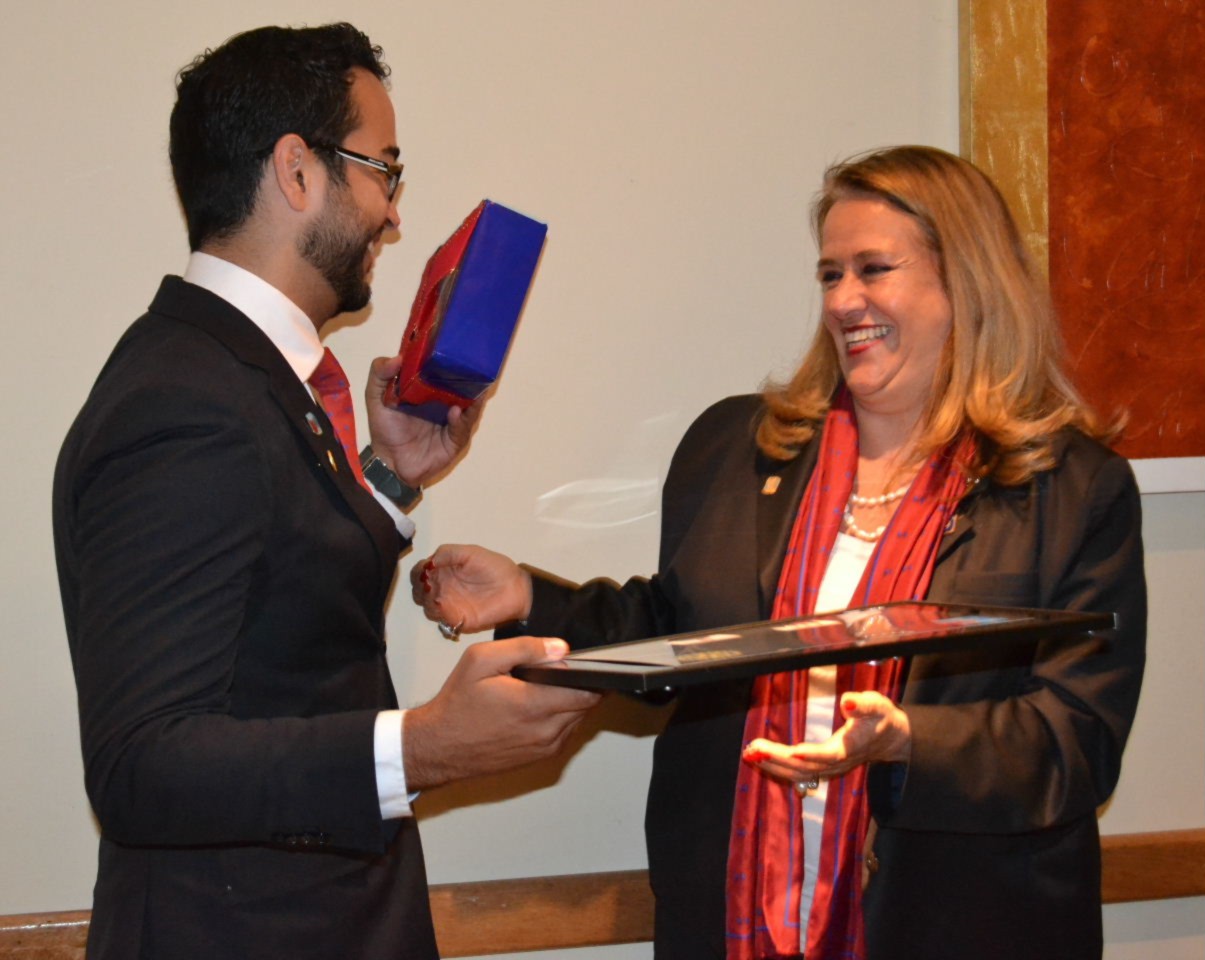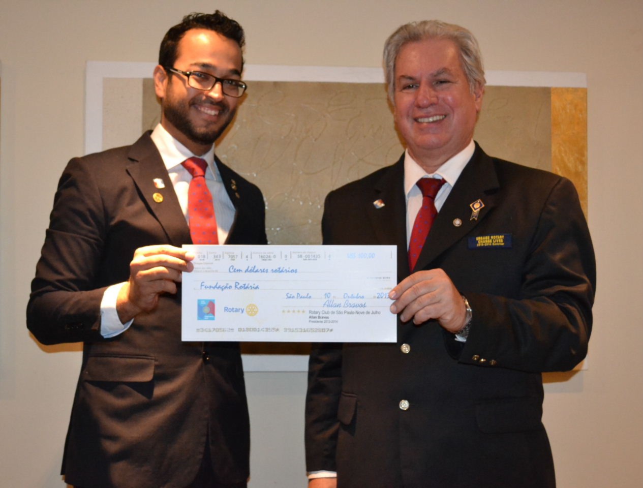 Ao finalizar seu pronunciamento, o presidente Allan entregou ao governador um cheque no valor de U$$100,00 doado pelo clube à Fundação Rotária.