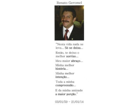 O RCSP Aeroporto perdeu no dia 21 de Janeiro o companheiro Renato Oswaldo Figueiredo Geromel, que está agora na presença do Grande Arquiteto do Universo. Geromel era companheiro sempre participativo em todos os momentos do clube, e tinha o Rotary como uma paixão. Ocupou diversas funções dentro do clube, e participou ativamente da Equipe Distrital na equipe do Intercâmbio de Jovens durante vários anos. Sentiremos saudades, companheiro!